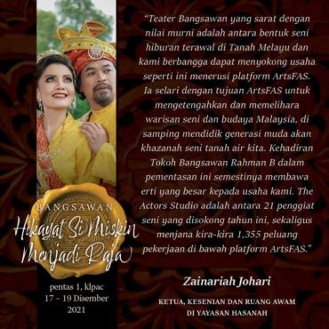 The Bangsawan Theatre, loaded with noble values, is one of the earliest forms of entertainment in Malaya and we are proud to support such efforts through the ArtsFAS (Arts for All Seasons) platform, an initiative by Yayasan Hasanah.