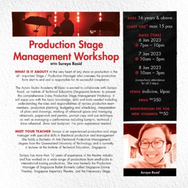 The academy is happy to collaborate with Suraya Rasid, an Institute of Technical Education (Singapore) lecturer, to present a comprehensive 3-day Production Stage Management Workshop.