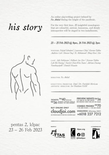 “His Story” presents the works of 8 new male writers from various backgrounds and age groups, under the direction of Fa Abdul. The monologues are based on real life experiences, with themes touching on human conditions and masculinity.