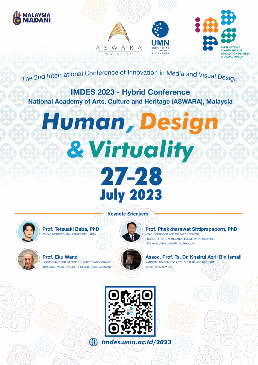 International Conference of Innovation in Media and Visual Design (IMDES 2023) is the 2nd international conference brought to you by Universitas Multimedia Nusantara (Indonesia) and National Academy of Arts, Culture and Heritage (ASWARA) (Kuala Lumpur, Malaysia) as co-organiser and host for the year 2023.