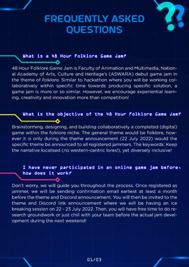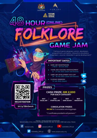 Are you a designer, artist, or developer and programmer of digital games? 🎮🎭🕹️ Faculty of Animation and Multimedia, ASWARA invites all individuals interested in digital game development to participate in 48 Hour Folklore (Online) Game Jam 2022. If this is your first time joining a game jam, don’t worry! Our 48 Hour Folklore Game Jam is definitely beginner-friendly — yet stand a chance to win our cash prizes for :
