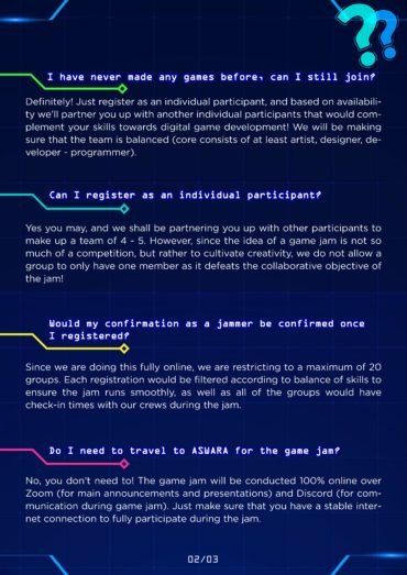 The programme is free and open to public where each participant will be involved according to their respective fields in the development of digital games in groups. Participation is limited to 20 groups (4 – 5 participants per group) throughout this online programme.