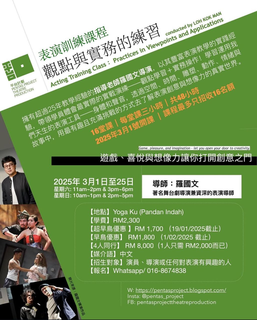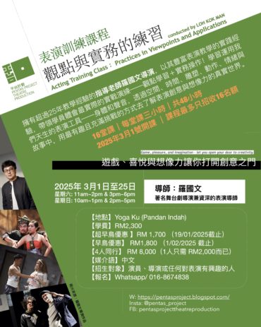 As such, Pentas Project is committed to offering a comprehensive acting training workshop: 16 sessions, each lasting 3 hours, for a total of 48 hours. With over 25 years of teaching experience, Director Loh Kok Man will lead participants through a program that combines viewpoint learning with hands-on practice.