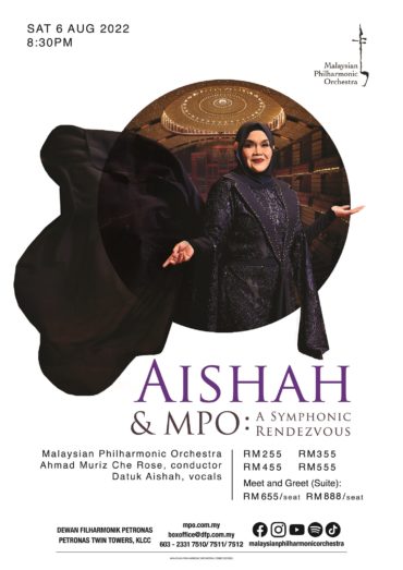 The undisputed queen of Malaysian pop joins the MPO in this long-awaited solo concert. Experience Aishah showcasing her legendary powerhouse vocals and performing her beloved tunes that includes “Janji Manismu” and “Camar yang Pulang”.