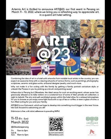 Artemis Art is pleased to announce their first event in Penang, taking place from 11 to 13 March 2022. ART@23 is a refreshing way to appreciate art, in a quaint art hotel setting, a weekend of visual arty fun for the whole family