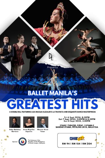 A world-class dance production featuring Ballet Manila – one of Southeast Asia’s leading ballet companies as presented by DanceLink in “Ballet Manila’s Greatest Hits in Malaysia. Headed by Artistic Director Lisa Macuja-Elizalde, the first non-Russian artist in the prestigious Kirov Ballet, the first part of the show will feature Macuja-Elizalde’s version of the opera-ballet “La Traviata”. The second part of the program will highlight a mix of classical, modern, neo-classical, and contemporary choreographies.
