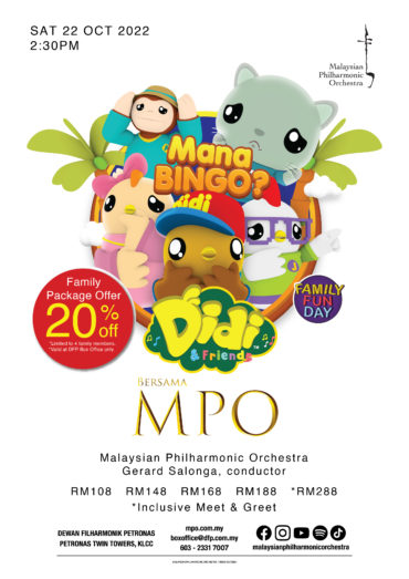 Didi & Friends, Malaysia’s No. 1 animation and the most beloved cartoon characters, are coming to you with the Malaysian Philharmonic Orchestra (MPO) in an exclusive one-day-only musical live at Dewan Filharmonik PETRONAS! This concert will take you on a journey with Didi, Nana & Jojo in their quest to find their missing cute little friend, Bingo! Join them in the search for Bingo and get entertained with hits such as Mengantuk Mumia and the traditional Eh Wau Bulan nursery rhyme. Don’t forget to shout Hora Horey! in this fun and heart-warming adventure with Didi & Friends and MPO!