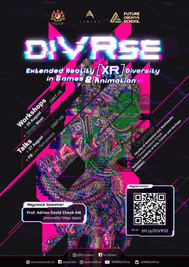 DIVRSE ’22 – Extended Reality (XR) Diversity in Games and Animation is powered by Faculty of Animation and Multimedia and Future Creative School, National Academy of Arts, Culture and Heritage’s (ASWARA). The webinar focuses on the potentials of Augmented Reality (AR) / Virtual Reality (VR) / Mixed Reality (MR) = Extended Reality (XR), and diversity and representation within games and animation — specifically narrowing down to dissect the potential of XR in the implementation of Malaysian culture and heritage.