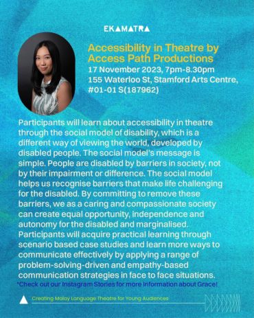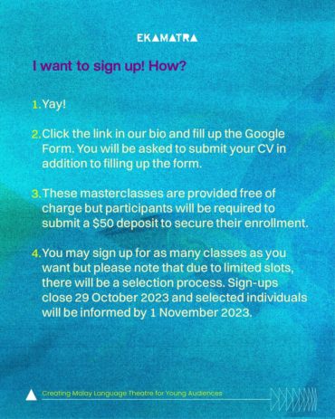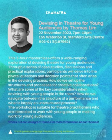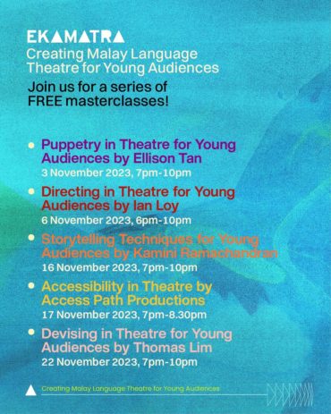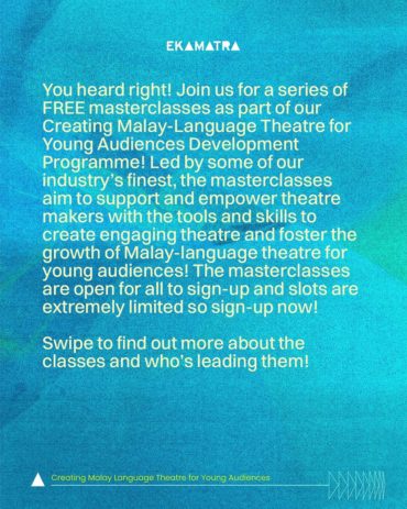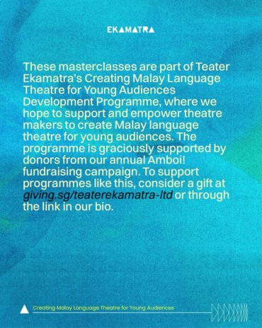 These masterclasses are part of Teater Ekamatra’s Creating Malay Language Theatre for Young Audiences Development Programme, where we hope to support and empower theatre makers to create Malay language theatre for young audiences.