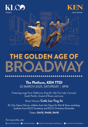 KL City Opera presents medleys and iconic number from musicals such as Oklahoma, South Pacific, King & I, the Sound of Music and more, featuring the KLCO Chorus, children from the Opera for Kids and Teens workshop and the KLCO Academy under. the direction of Dr. Cadis Lee Ying Jia supported by the KLCO Orchestra ensemble.
