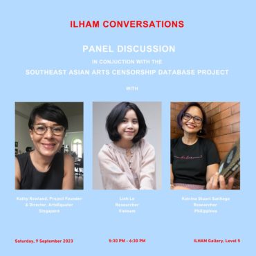 The panel includes Kathy Rowland, Project Founder and Director of ArtsEquator, Singapore, Linh Le, Researcher, Vietnam, and Katrina Stuart Santiago, Researcher, the Philippines. Please join us on Saturday, 9 September, at 5:30