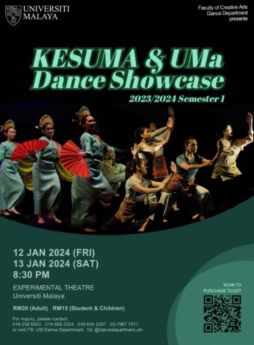 Brace yourselves for an unforgettable cultural spectacle as the Faculty of Creative Arts Dance Department, Universiti Malaya, presents the much-anticipated KESUMA & UMa Dance Showcase 2023/2024 Semester 1! This production features mesmerising traditional KESUMA dances and contemporary UMa dances for two days, on January 12-13, 2024 (Friday and Saturday), at 8.30 p.m., at the Experimental Theatre, Universiti Malaya.