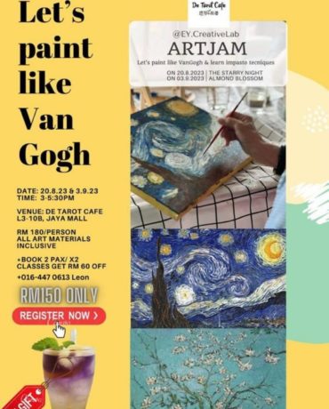 Unwind while you learn #vangogh impasto technique, allowing your inner creativity to flourish. Join for a therapeutic experience, where all materials and guidance are provided, and you get to work on a canvas size of 30×40 cm. To add to the enjoyment, De Tarot Cafe offers a refreshing drink of your choice during the session.