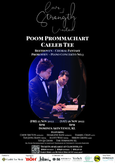 Two young artists based in Malaysia are collaborating for the first time. Pianist Poom Prommachart and Conductor Caeleb Tee is committed to bringing 2 virtuosic work to live. The celebrated Choral Fantasy by Ludwig Van Beethoven, uniquely scored for piano, 6 vocalists, choir, and orchestra, and the exhilarating Third Piano Concerto by Sergei Prokofiev, one of the most intense among piano repertoires.