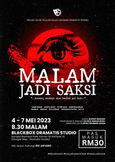 Dramatis Studio akan mementaskan teater “Malam Jadi Saksi” pasca-Aidilfitri pada 4-7 Mei 2023 ini! Ini merupakan pementasan pertama kali di blackbox kami! Pementasan bermula pada jam 8.30 malam. Pas masuk hanya RM30 sahaja. Karya Rupert Brooke, diterjemah dan diarahkan oleh Zayrul Iqwan Rosli. Suka kami kongsikan bahawa teater ini dijayakan oleh pelajar kelas lakonan kami dibawah bimbingan Rosli Rahman Adam.