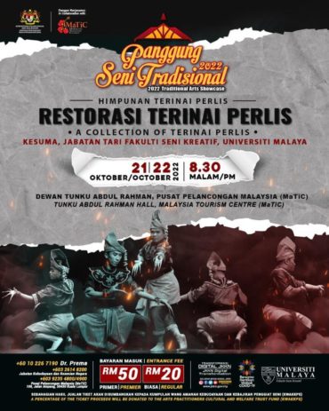 Restorasi Tari Perlis is a classical dance production, the first initiative to bring together all the repertoires of Terinai in a single show. It is a collaboration between JKKN and KESUMA Universiti Malaya, funded by the Ministry of Tourism, Arts and Culture (MOTAC). This program is part of the Panggung Seni Traditional (PST) 2022. The repertoires are put together by Adjunct Prof. Dr.Zamin Haroon, the Terinai Expert. It is also a collaborative effort between various dance institutions (UM, ASWARA and UPSI) and organizations (JKKN and PADAT) in Malaysia. This multifaceted program encapsulates dance to live music, multi-media presentations, conversations, and demonstrations. Tickets are priced RM20 and RM50. This show is open to anyone who is interested to see and be educated about Malay traditional dance form, Terinai which has been revived and reconstructed through dance research. It is educational and promotes cultural awareness.