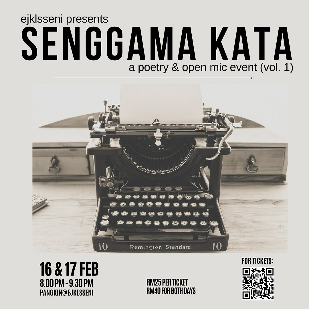 Senggama Kata is a periodical poetry event by EJKLS Seni. It aims to bring together Malaysian poets to share and showcase their poetic works on a shared space regardless of language and contents. For each volume, 6 featured poets will perform on each day of the event with no specific theme (with a total of 12 featured poets for both days collectively); and thus, performers are free to select their own contents (taboo-contents are allowed as long as they are presented in a respectful manner) and are free to creatively compose how their performance will be executed (the performance can be spoken word, visualization, etc).