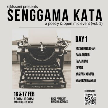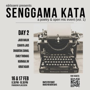 Senggama Kata is a periodical poetry event by EJKLS Seni. It aims to bring together Malaysian poets to share and showcase their poetic works on a shared space regardless of language and contents. For each volume, 6 featured poets will perform on each day of the event with no specific theme (with a total of 12 featured poets for both days collectively); and thus, performers are free to select their own contents (taboo-contents are allowed as long as they are presented in a respectful manner) and are free to creatively compose how their performance will be executed (the performance can be spoken word, visualization, etc).