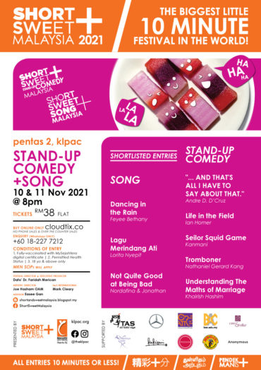 With the exception of SHORT+SWEET Film (which will premiere online on CloudTheatre), the remaining segments will be performed live over a compact 2-week period in Kuala Lumpur before continuing in Penang. Starting with SHORT+SWEET Stand-Up Comedy & Song on 10 November, it will continue with SHORT+SWEET Film and SHORT+SWEET Musical that same week before crossing over to SHORT+SWEET Dance and Theatre the following week.