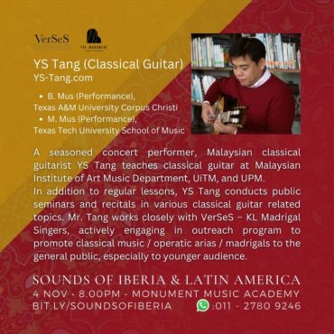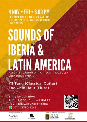 Come enjoy an evening of classical guitar, voice and flute Iberian and Latin music with YS Tang (Classical Guitar) and Foo Chie Haur (Flute).