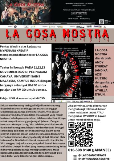 La Cosa Nostra yang akan membawa penonton kembali ke zaman Itali era akhir 19 dan awal 20an mengisahkan tentang kekuasaan wang seringkali dijadikan tuhan yang disembah manusia sanggup melakukan apa apa sahaja demi cita – cita. Vito adalah pemuda yang dilahirkan dalam masyarakat miskin lantaran kehidupan sedemikian telah membentuk dirinya untuk menjadi seorang penjenayah jalanan. Dengan bantuan rakannya Lucky, Vito telah terjebak ke kancah dunia mafia yang penuh hiprokrasi dan dendam. Untuk mengetahui kisah Vito dengan lebih lanjut di dalam dunia La Costra Nostra, jom saksikan pementasan ini pada