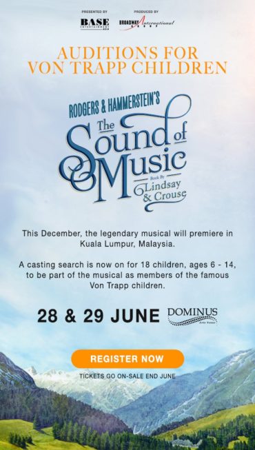 Presented by Base Entertainment Asia and Produced by Broadway International Group, the world’s most beloved musical – THE SOUND OF MUSIC is coming to Malaysia for the first time this December and a casting search is now on in Malaysia for 18 children, ages six to 14, to be part of the musical as members of the famous von Trapp children.