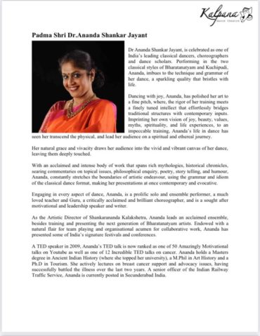 ear Friends & Patrons, Kalpana Dance Theatre is honoured and delighted to present in Kuala Lumpur – the Legendary Dancer, Choreographer and Dance Scholar Padma Shri Dr Ananda Shankar Jayant in a Bharathanatyam presentation. She will be accompanied by her disciple, Kumari Neha Sathanapalli. Details of the program are as follows: