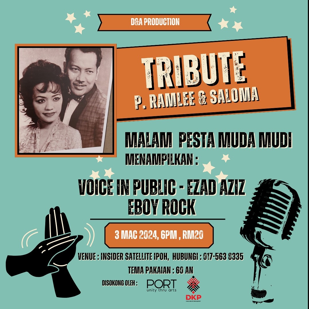Dibawakan oleh D & A Production. Acara persembahan muzik Tribute to P. Ramlee dan Saloma bakal diadakan pada 3 Mac 2024 di Insider Satellite Ipoh sempena bulan kelahiran biduan tanah air ini.