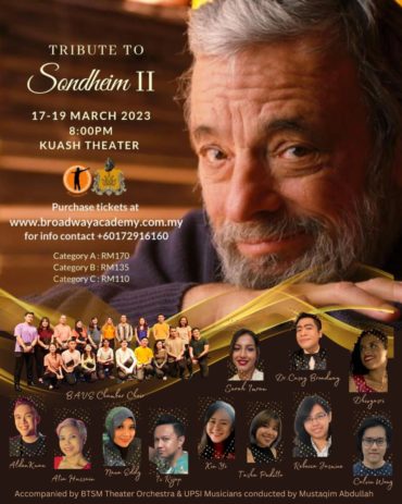 Sondheim is credited for having “reinvented the American musical” with shows that tackle “unexpected themes that range far beyond the [genre’s] traditional subjects” with “music and lyrics of unprecedented complexity and sophistication”. His shows address “darker, more harrowing elements of the human experience”, with songs often tinged with “ambivalence” about various aspects of life. Enjoy a night of beautiful song and music from Sondheim presented by Broadway Academy and Broadway Theater Society Malaysia (BTSM) talents with sepcial appearance by BAVE Chamber Choir, accompanied by musicians from Universiti Pendidikan Sultan Idris (UPSI) Faculty of Music & Broadway Academy Theater Orchestra.