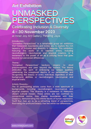 “Unmasked Perspectives” is a remarkable group art exhibition that transcends boundaries and invites you to explore the rich tapestry of inclusion and diversity in Malaysia. This exhibition, featuring the works of 13 talented artists, including neurodivergent, neurotypical, and atypical creators, is a testament to the power of art as a unifying force that goes beyond our perceived differences.