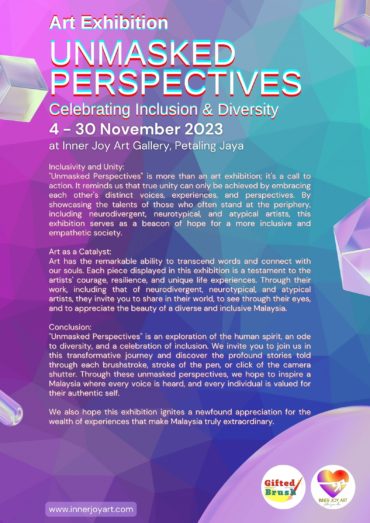 “Unmasked Perspectives” is an exploration of the human spirit, an ode to diversity, and a celebration of inclusion. We invite you to join us in this transformative journey and discover the profound stories told through each brushstroke, stroke of the pen, or click of the camera shutter. Through these unmasked perspectives, we hope to inspire a Malaysia where every voice is heard, and every individual is valued for their authentic self.