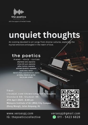 “Unquiet Thoughts” is an art song recital that explores the myriad of emotions entangled in the realm of love. This captivating art song recital showcases a rich selection of poetry spanning millennia and continents, exploring the complexities of human connection and desire.
