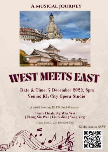 West Meets East will be presented by Ng Wen Wei (Cello), Cheah Pen Ny (Piano), Chang Xin Wen (Vocal), Lin Li Jing (Vocal, Guzheng), Yang Ying (Vocal, Guzheng) with piano accompaniment by Dr Bernard Tan.